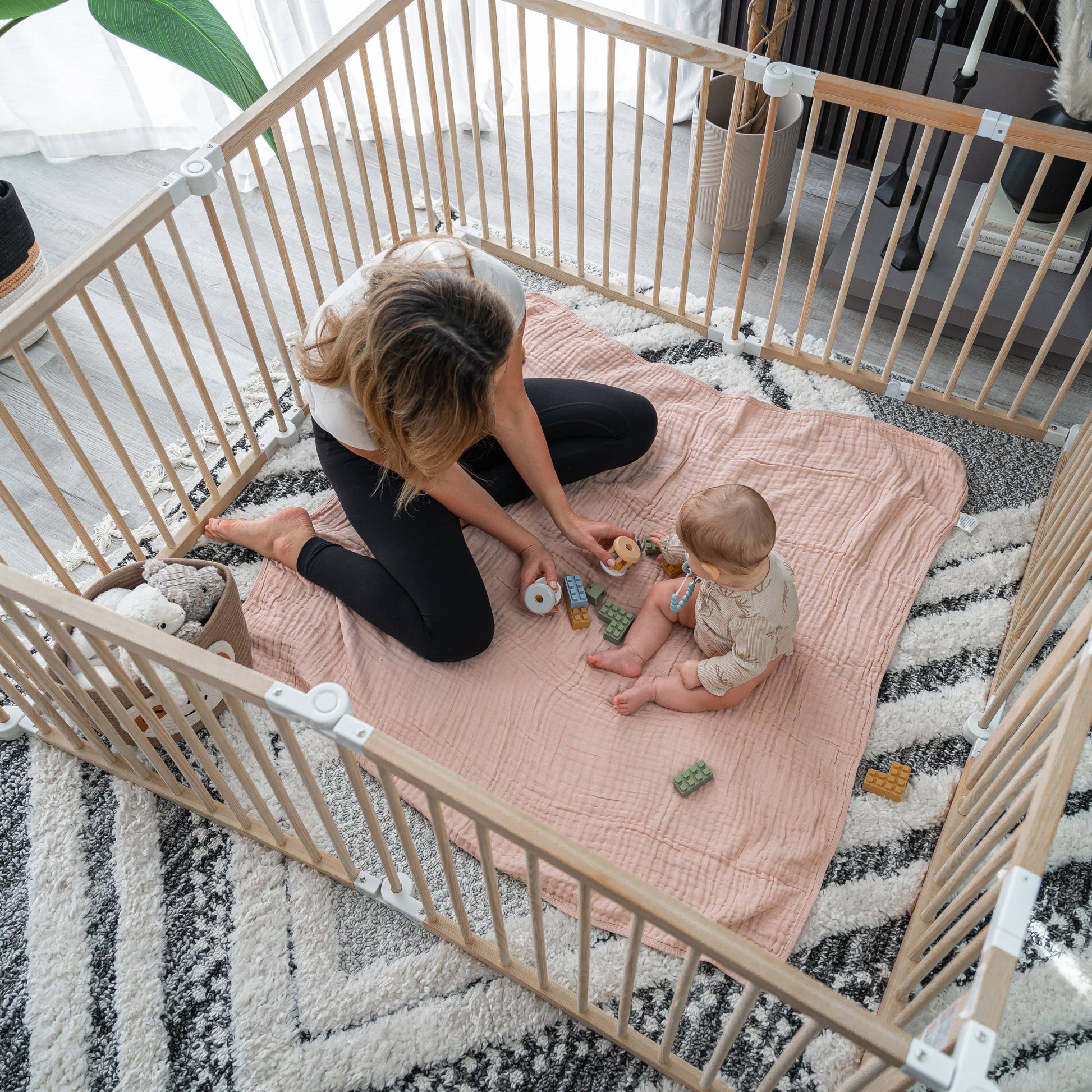 ⚫ Plush Muslin Cotton – Softer and more breathable than standard baby blankets this large muslin blanket features 6 individual layers carefully woven together to create enhanced comfort that your baby can feel.