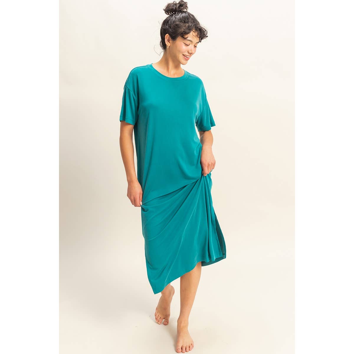 Casual Midi Dress Featuring A Round Neckline, Short Sleeves, And A Pull-On Design. Constructed From Soft, Lightweight Fabric With An Oversized Silhouette. Finished With A Side Slit At The Hem For Added Comfort And Movement.