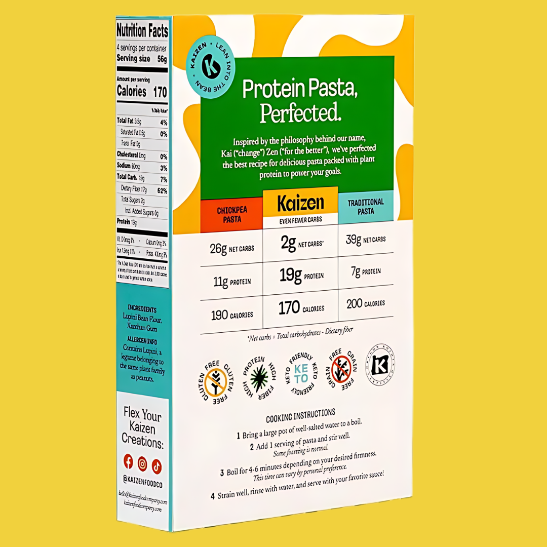 Kaizen’s 2g Net Carb High Protein Fusilli Pasta turns low carb dining into a delightful affair.