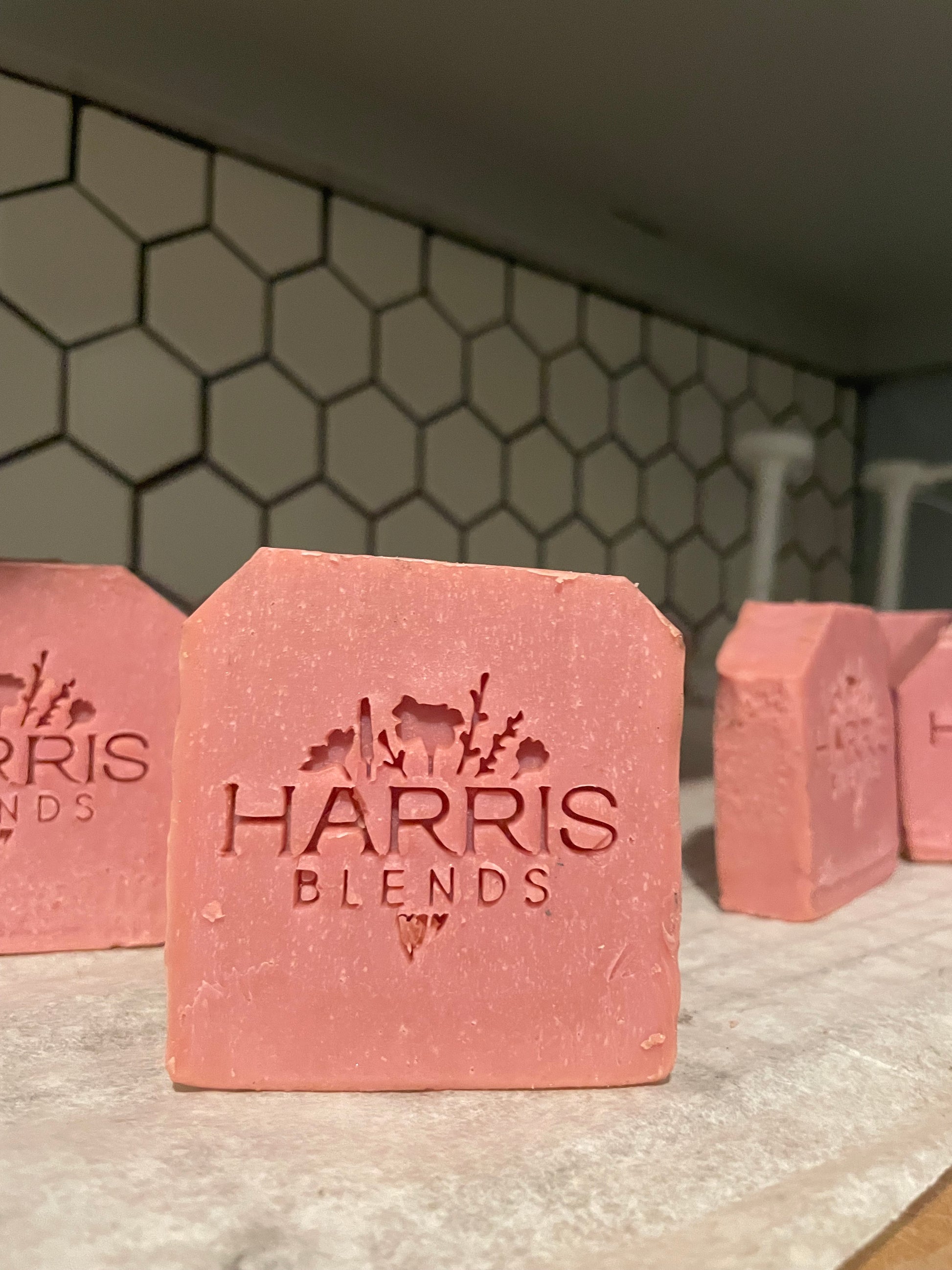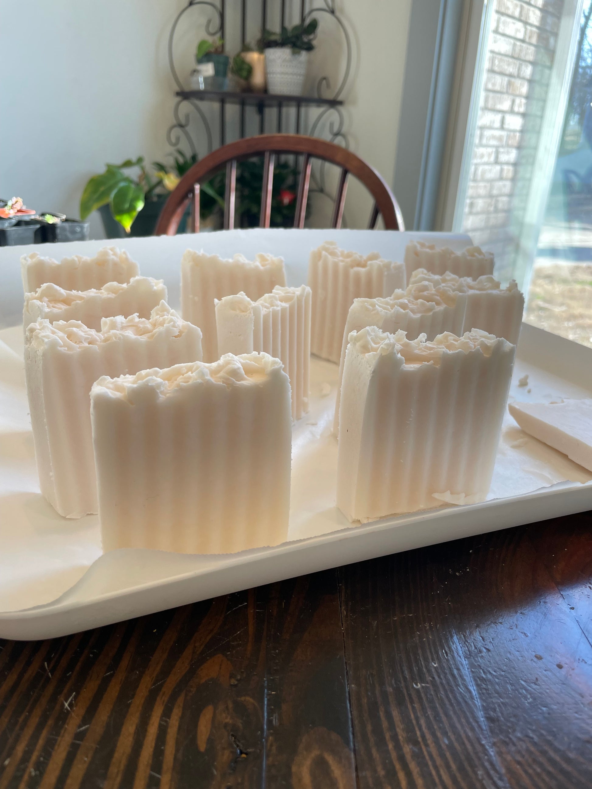 Tallow & coconut oil blended with coconut milk using lye and mica colorant.